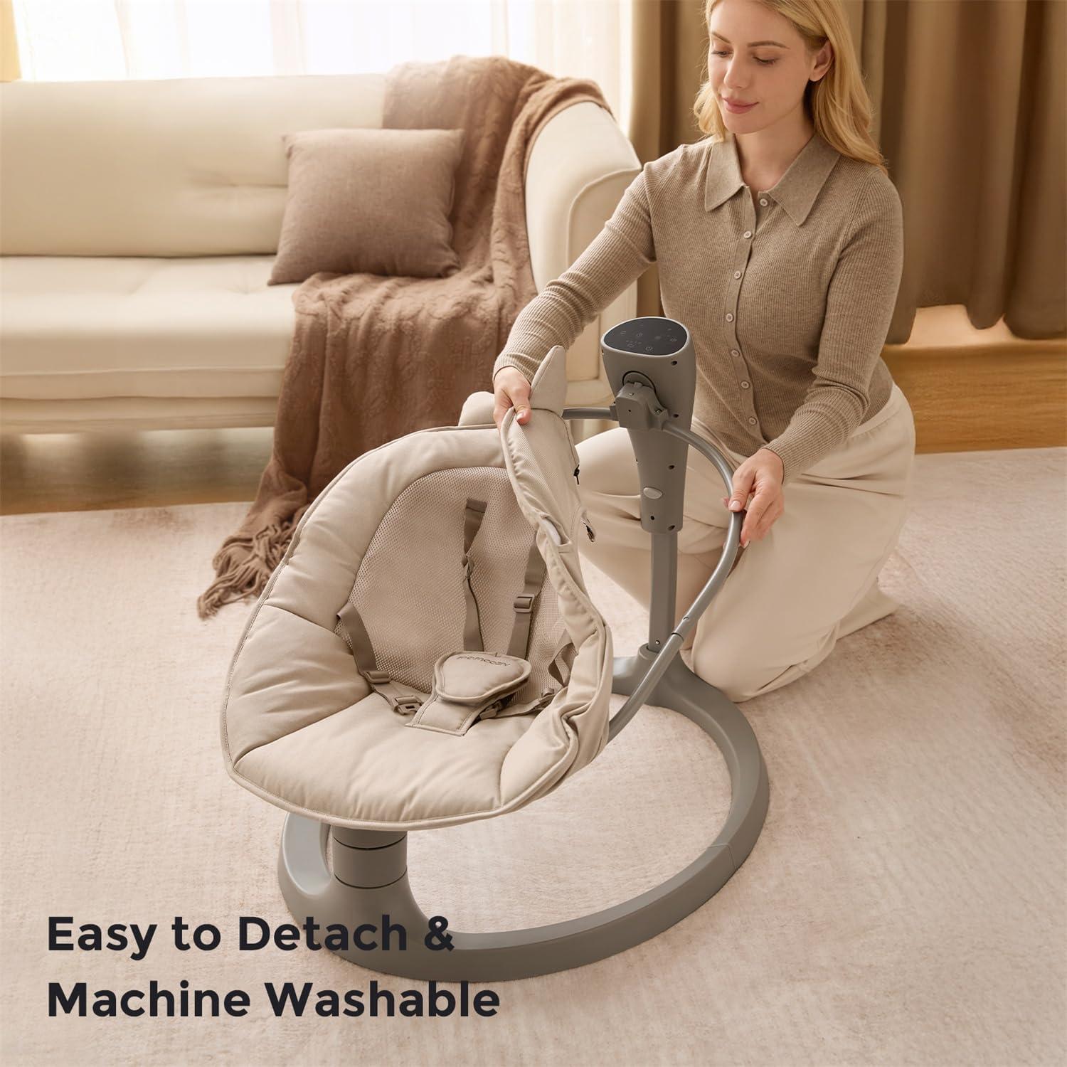 Momcozy 2-in-1 Electric Baby Swing, Dual-Arm Support System & Parent-Inspired Motions, Convertible to Toddler Seat up to 66 lbs, Adjustable Height, Lightweight, Khaki