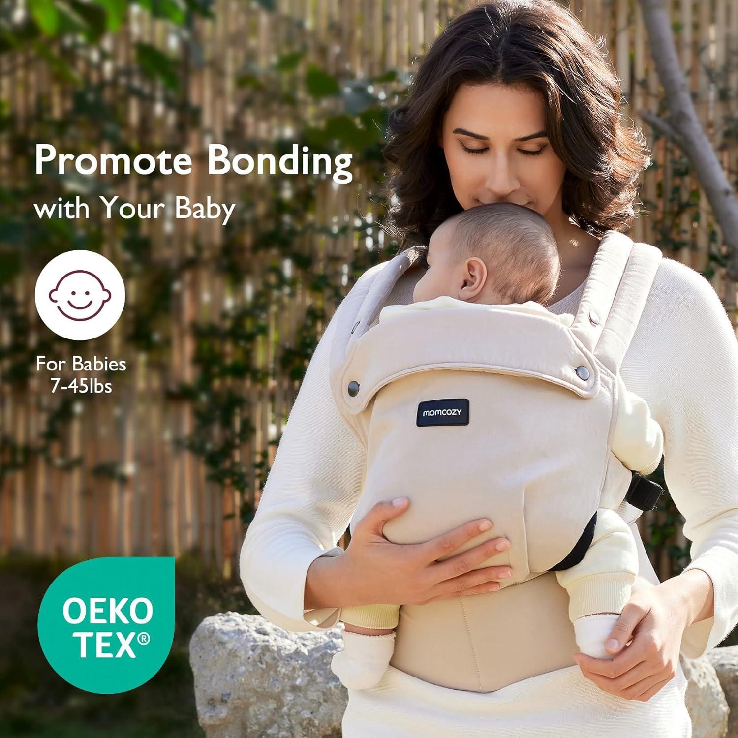 imageMomcozy Baby Carrier Ergonomic Cozy and Lightweight Carrier Effortless to Put On Ideal for HandsFree Parenting Enhanced Lumbar Support GeometryCottonKhaki