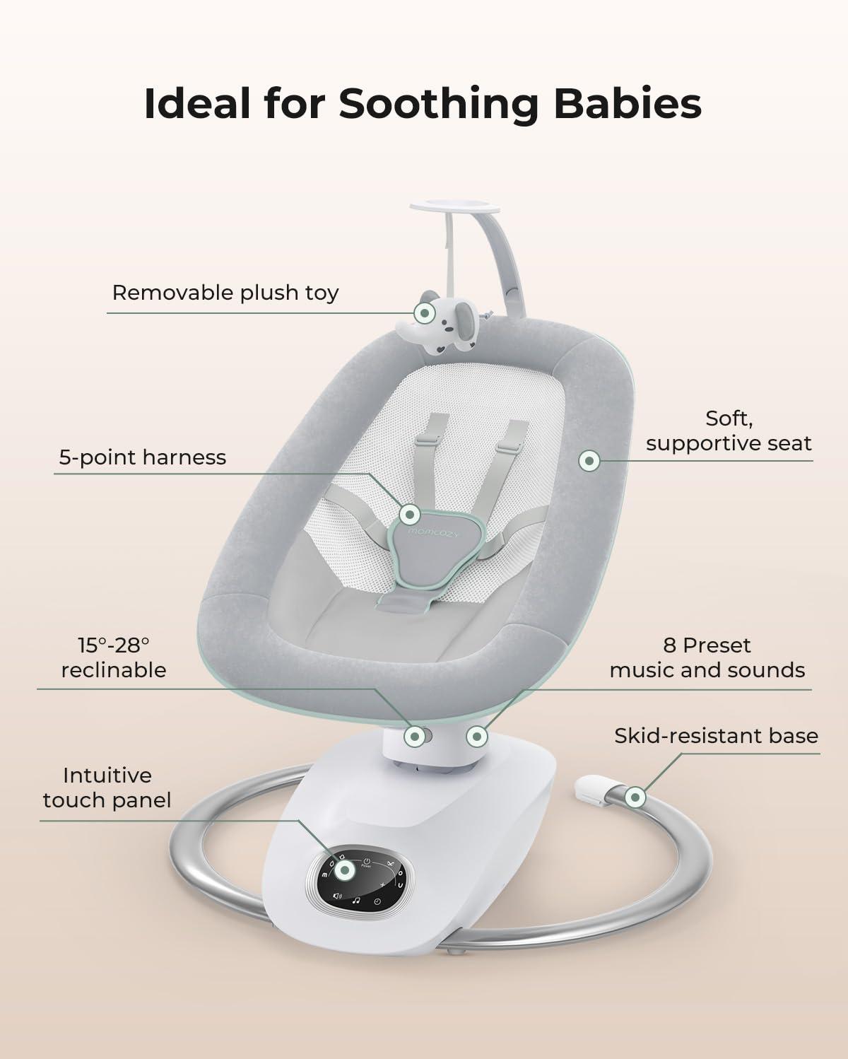 Momcozy CocoSway 3D-Motion Baby Swing for Infants to Toddlers, 6 Motion Modes & 4 Speeds, 180° Rotating Seat, Remote Control, Reclining Seat with 5-Point Harness, 8 Preset Lullabies, Grey(Gray)