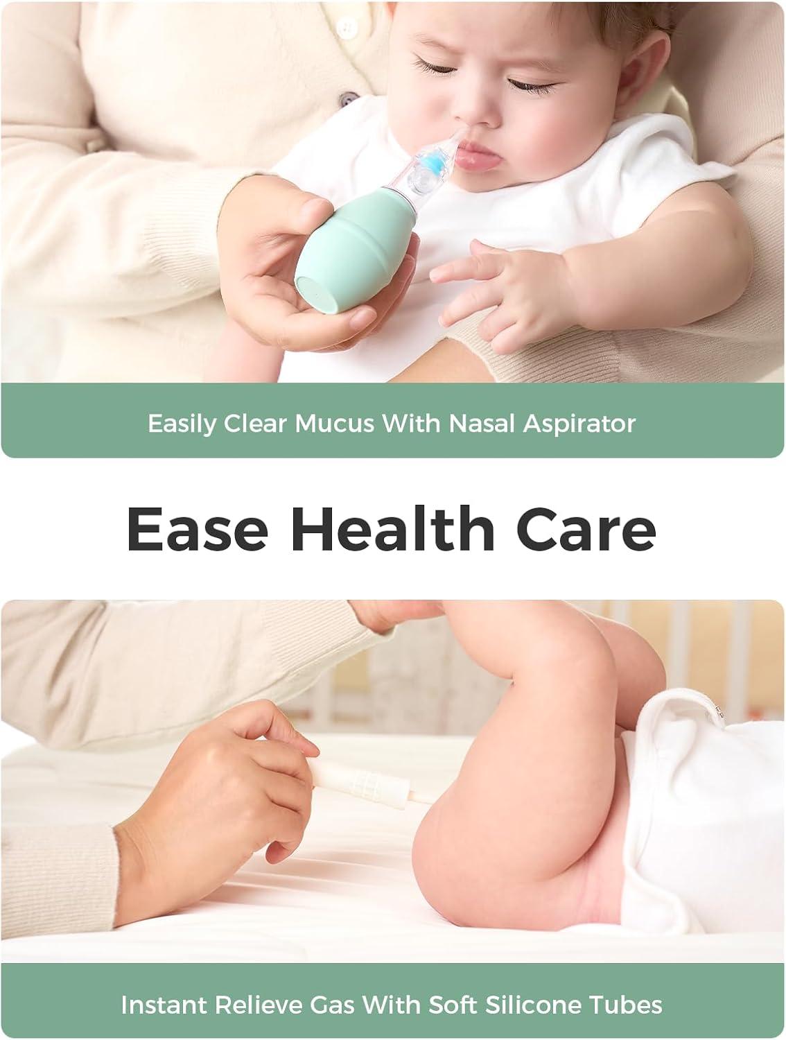 The All-in-1 Momcozy Baby Elite Kit – Superior Baby Shower & Registry Essential Kit covers 3 main baby care scenarios: Grooming, Health, and Cleanse. Including an electric nail trimmer, electric nasal aspirator, heated tummy wrap, thermometer, medicine pacifier, bath brush, cradle cap brush, teether, finger toothbrush, and comb, meet all the superior demands of the baby