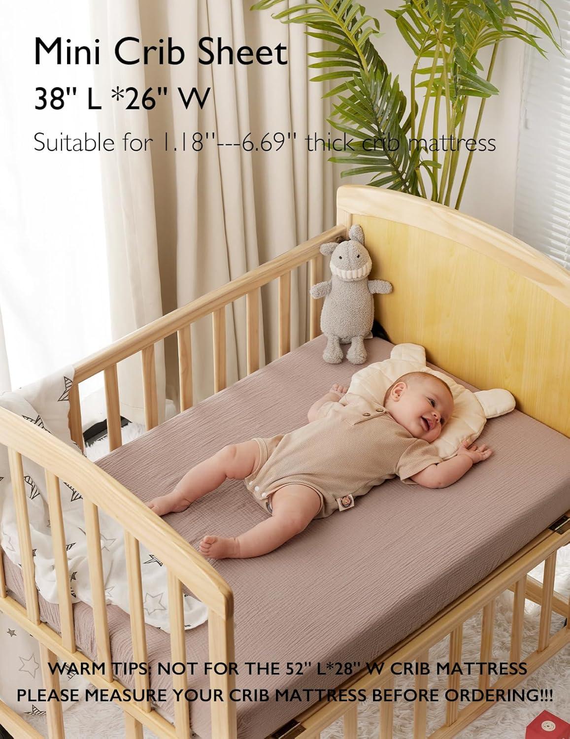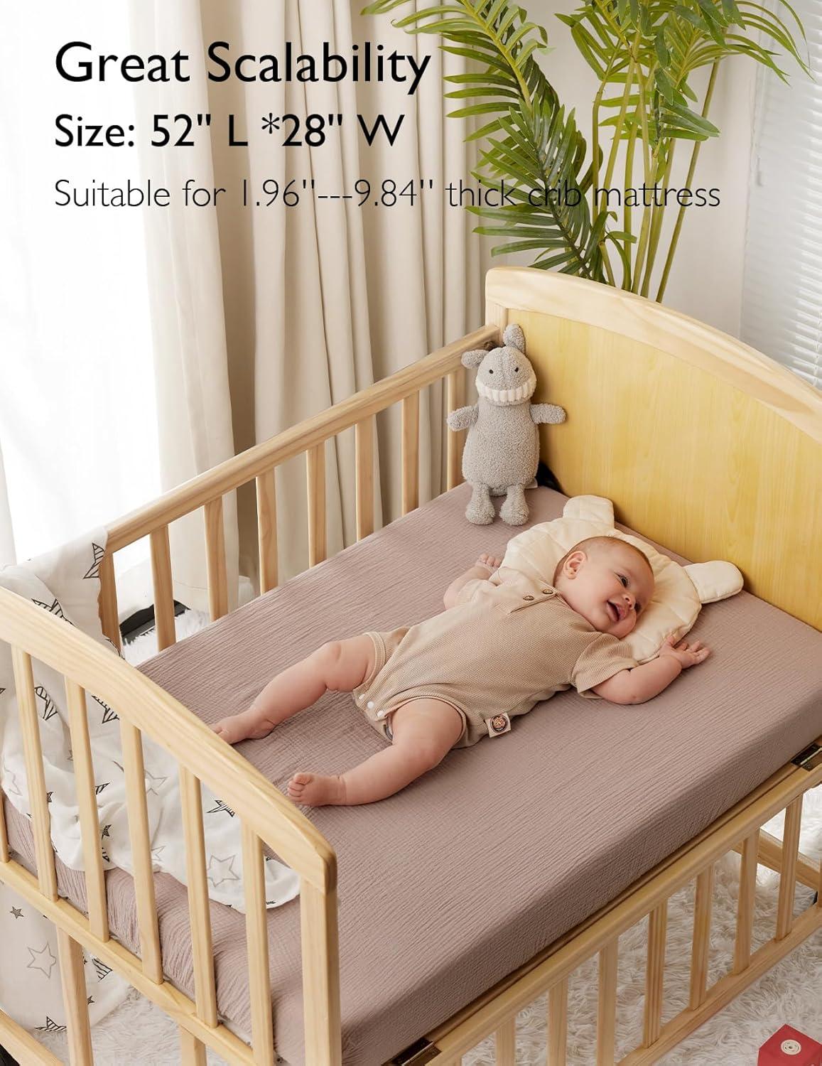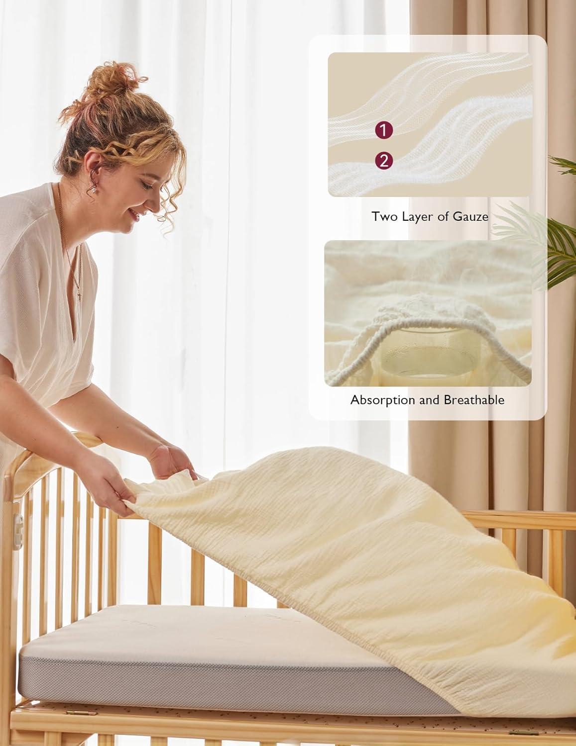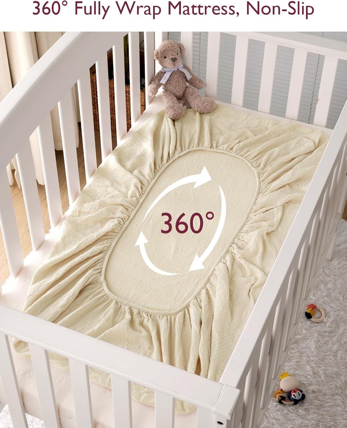 【Baby Sleep Soundly with Moisture-Absorbent and Breathable Fabric】Breathable and lightweight double-layer gauze boys and girls mattress crib sheet let baby breathe through bed sheet and mattress, allows for proper air circulation and doesn’t trap heat to help regulate baby's body temperature while they sleep. Absorbs extra moisture in the air promptly to keep baby body fresh and dry, suitable for all seasons, warm in winter and no hot sleeping in summer.