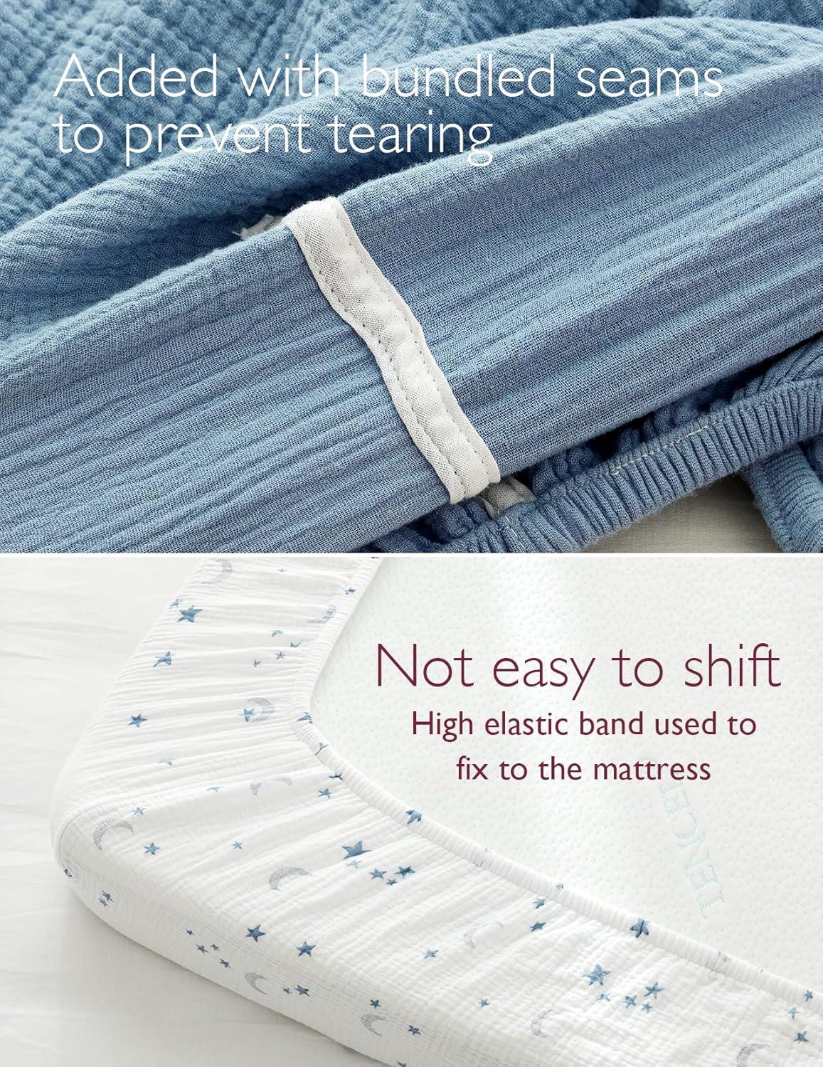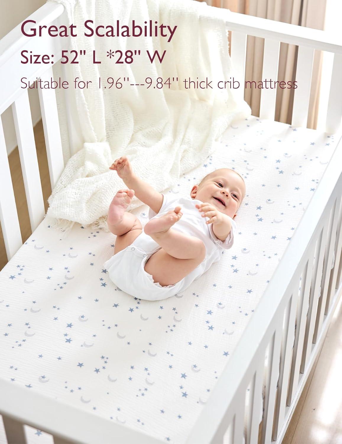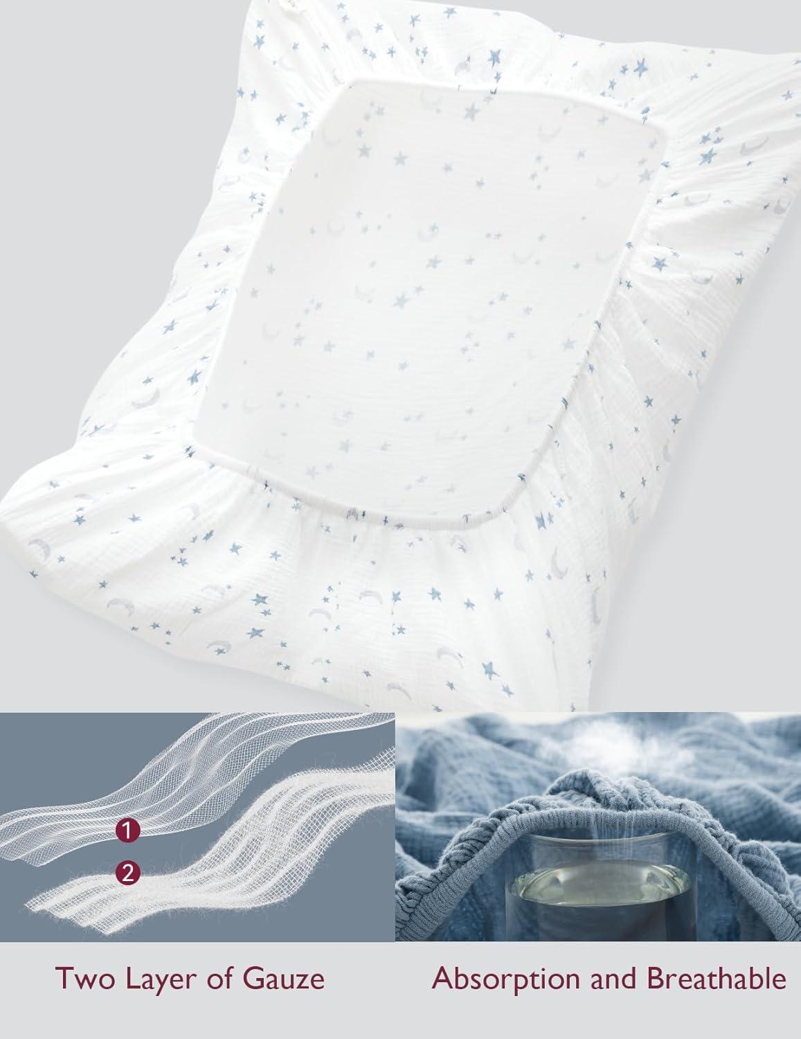 【Baby Sleep Soundly with Moisture-Absorbent and Breathable Fabric】Breathable and lightweight double-layer gauze boys and girls mattress crib sheet let baby breathe through bed sheet and mattress, allows for proper air circulation and doesn’t trap heat to help regulate baby's body temperature while they sleep. Absorbs extra moisture in the air promptly to keep baby body fresh and dry, suitable for all seasons, warm in winter and no hot sleeping in summer.
