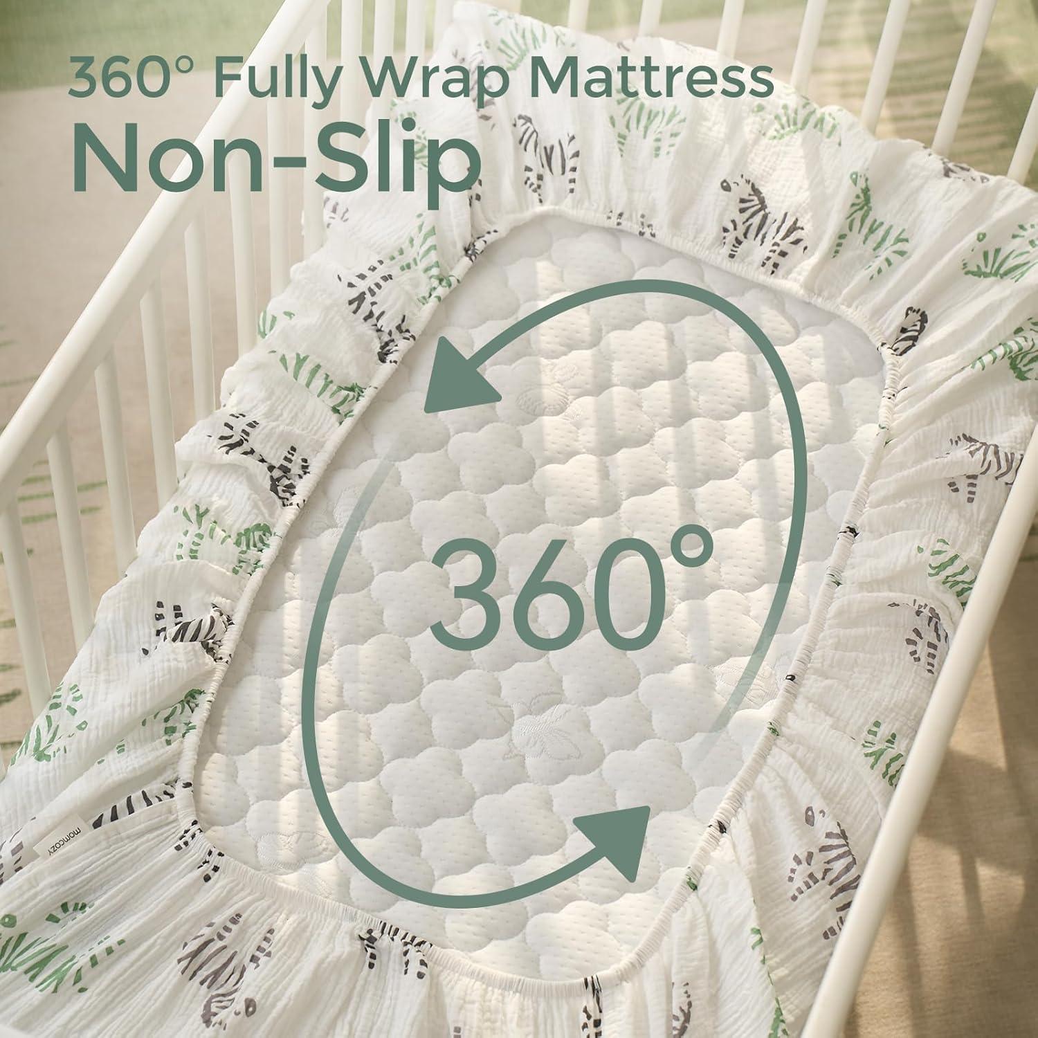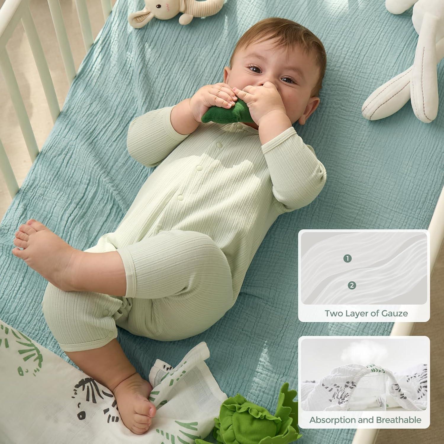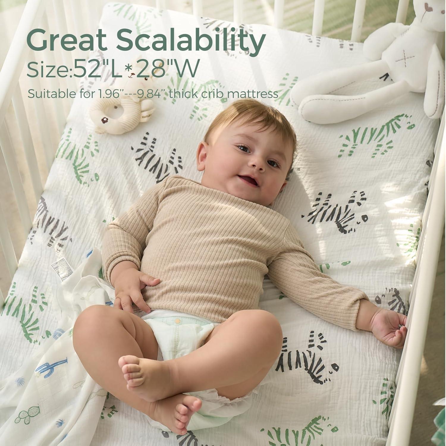 【Baby Sleep Soundly with Moisture-Absorbent and Breathable Fabric】Breathable and lightweight double-layer gauze boys and girls mattress crib sheet let baby breathe through bed sheet and mattress, allows for proper air circulation and doesn’t trap heat to help regulate baby's body temperature while they sleep. Absorbs extra moisture in the air promptly to keep baby body fresh and dry, suitable for all seasons, warm in winter and no hot sleeping in summer.