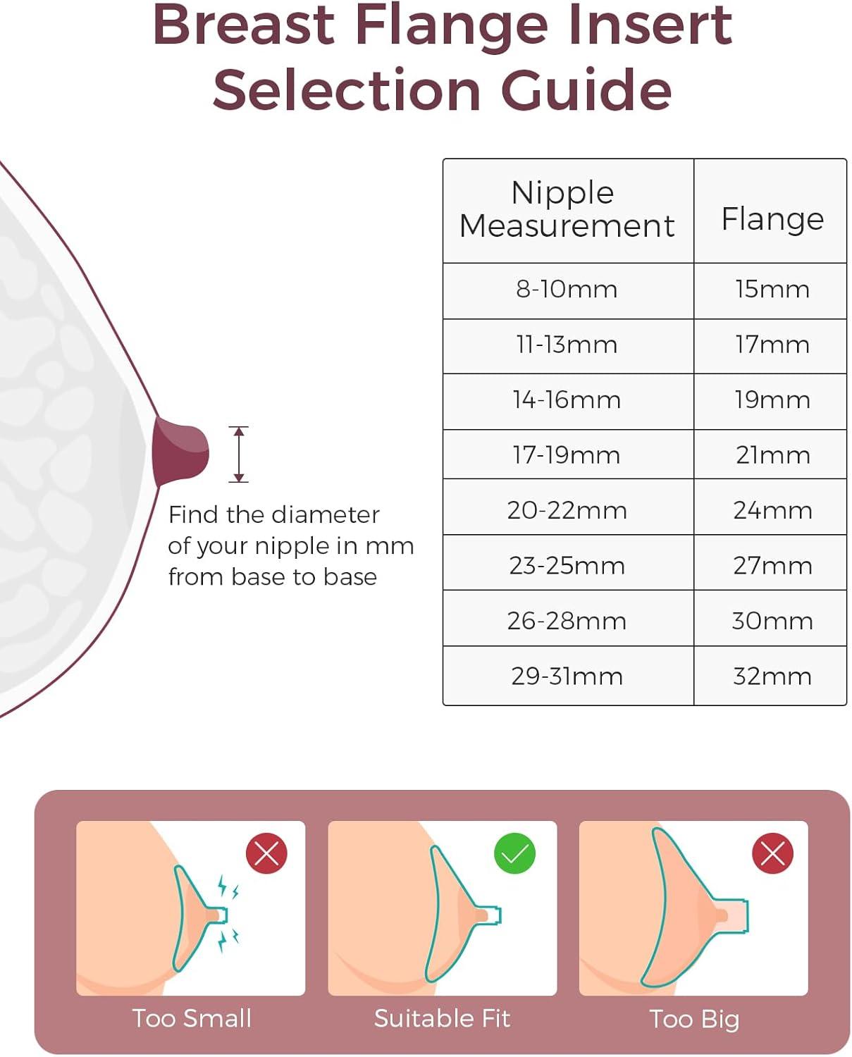 Find Your Perfect Fit: Choosing the correct flange size is essential for comfort and efficiency. If you experience nipple swelling, rubbing, or squeezing during pumping, you may need a different size. Measure regularly and change inserts as needed.
