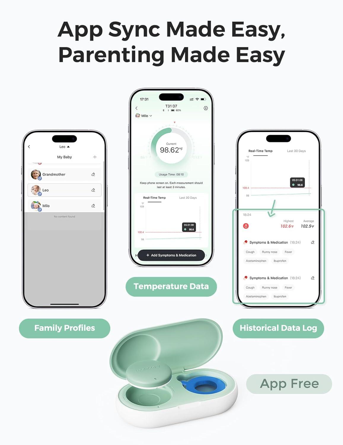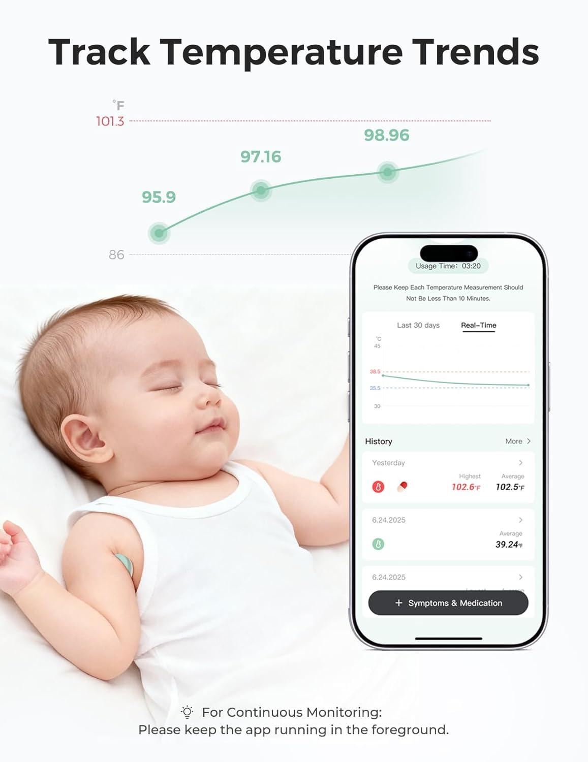 【Continuous Monitoring & Temperature Trend Tracking】 This wearable smart baby thermometer continuously tracks your baby’s temperature while the Momcozy App is active in the foreground and connected. It automatically generates easy-to-read temperature trend charts, allowing you to visualize changes over time. You can also manually record related symptoms for more complete monitoring. The clear temperature trends turn uncertainty into insight, helping parents care with greater confidence and peace of mind.